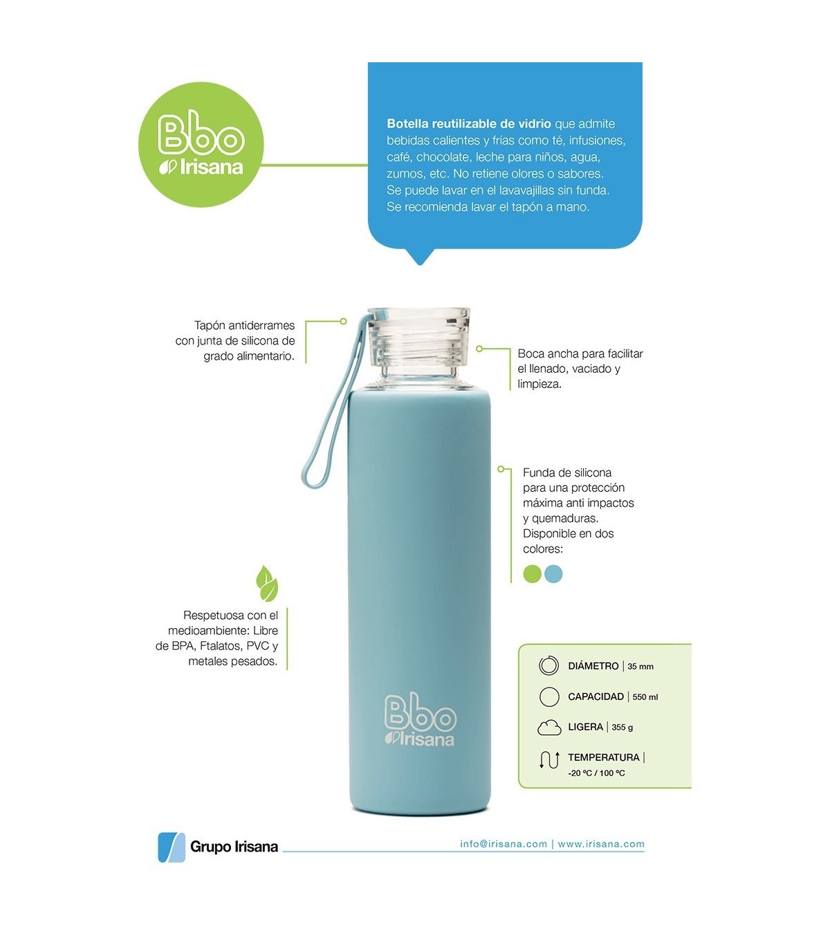 Botella reutilizable Bbo Irisana de Borosilicato con funda de Silicona.