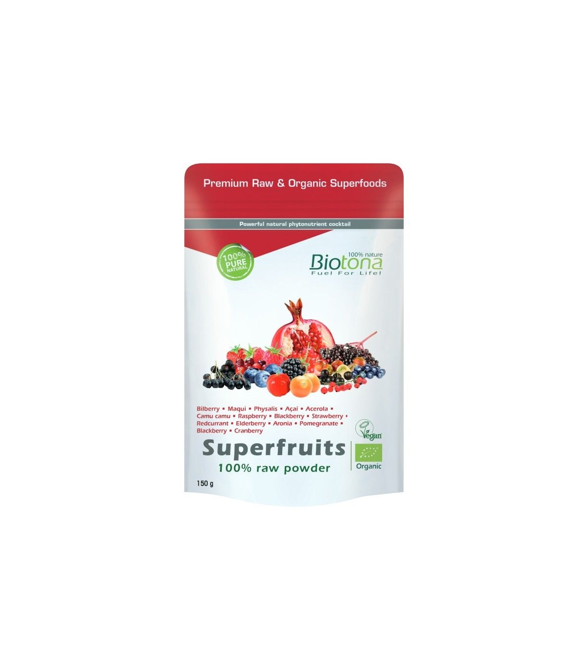 Polvo (100%) de mirtilos*, goji*, frambuesa*, mora silvestre*, maqui*, açaí*, fresa*, grosella*, saúco*, acerola*, aronia*, granada*, grosella negra*, morera negra*, camu camu*, arándano rojo*. (*Cultivo ecológico)**. **(Vaccinium myrtillus, Lycium barbarum, Rubus idaeus, Rubus plicatus, Aristotelia chilensis, Euterpe oleracea, Fragaria, Ribes rubrum, Sambucus nigra, Malpighia glabra, Aronia melanocarpa, Punica granatum, Ribes nigrum, Morus nigra, Myrciaria dubia, Vaccinium oxycoccus)