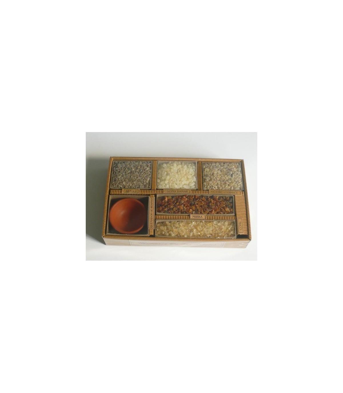 La caja contiene 5 tipos de resinas: Mirra, Incienso (Olíbano), Copal, Benjuí y Goma Damar, junto con un quemador de cerámica.